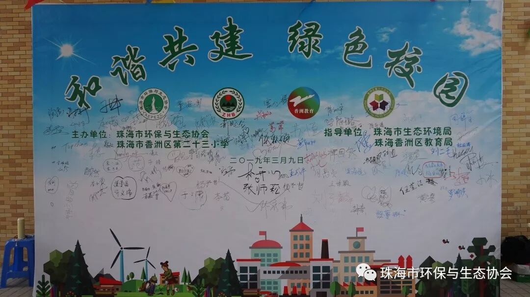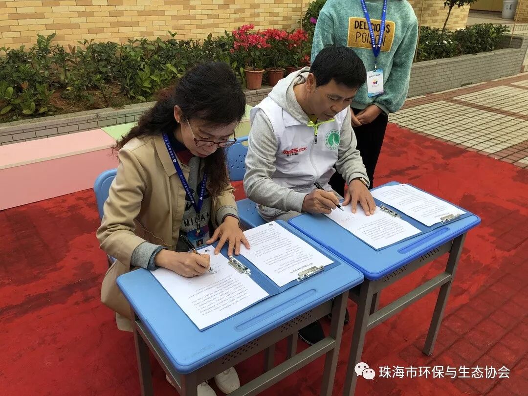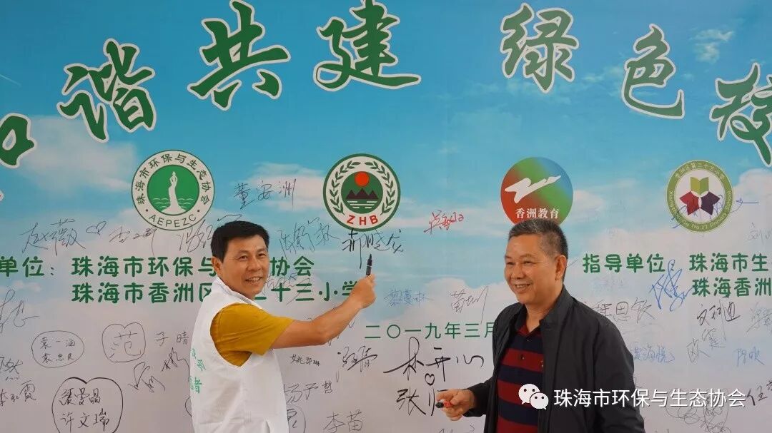 珠海市环保与生态协会郝晓龙会长表示:“珠海市环保与生态协会作为珠海市环保行业社会公益组织,我们一直在宣扬环境保护,推进生态文明建设,本次和二十三小学携手植树,旨在将环保宣传教育引入学校,让小朋友主动参与到植树节活动中来,亲身体验劳动的乐趣,感受美化环境的意义,保护环境,从娃娃抓起,让小朋友们从小树立坚定的保护环境的意识”。香洲区第二十三小学的葛萍校长也对协会组织的公益植树活动表示衷心感谢,并代表学校和协会郝会长签订了“携手共建绿色校园”协议书,同时吴副调研员、郝会长和葛校长进行了“和谐共建 绿色校园”揭牌仪式。